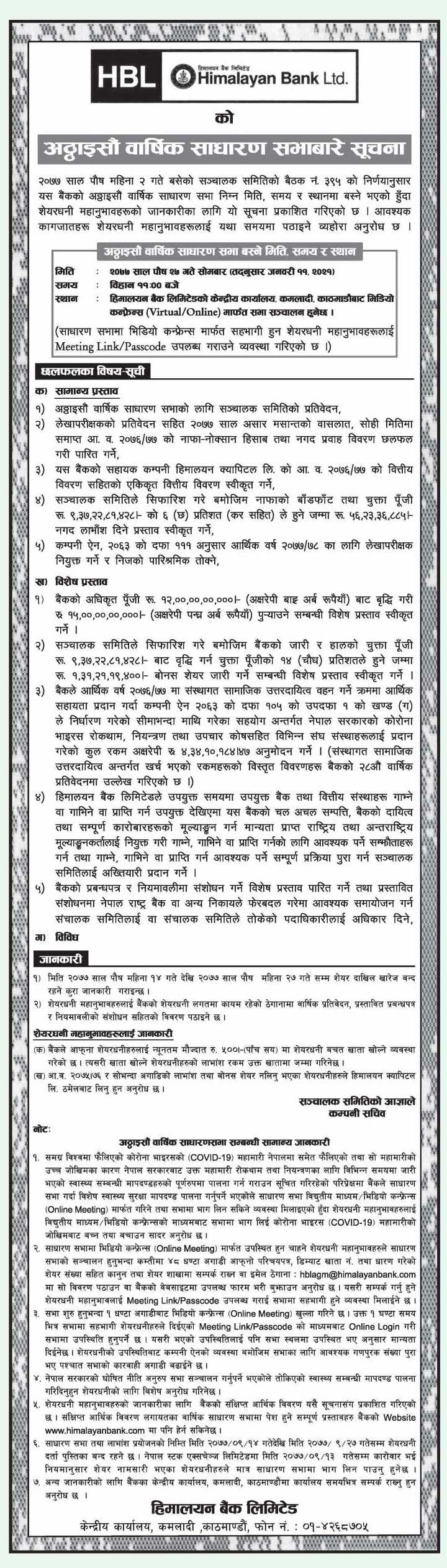 काठमाडौँ । हिमालयन बैंक लिमिटेडले वार्षिक साधारण सभा पुस २७ गते हुने भएको छ । बैंकको पुस २ गते, बिहीबार बसेको सञ्चालक समितिको बैठकले गरेको निर्णय अनुसार बैंकको २८औं वार्षिक साधारण सभाको मिति तय गरेको हो । उक्त सभा बैंकको केन्द्रिय कार्यालय, कमलादी, काठमाडौँमा बिहान ११ बजेबाट भर्चुअल माध्यमबाट सञ्चालन हुने जनाएको छ ।