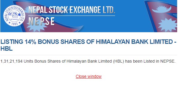 काठमाडौं । नेपाल स्टक एक्सचेञ्ज(नेप्से)मा हिमालयन बैंकको बोनस शेयर सूचीकृत भएको छ ।नेप्सेमा बैंकको १ करोड ३१ लाख २१ हजार १९४ कित्ता बोनस शेयर सूचीकृत भएको हो । यो बोनस शेयर शेयरधनीको हितग्राही खातामा आएपछि शेयरधनीले खरीदबिक्री गर्न सक्नेछन् ।