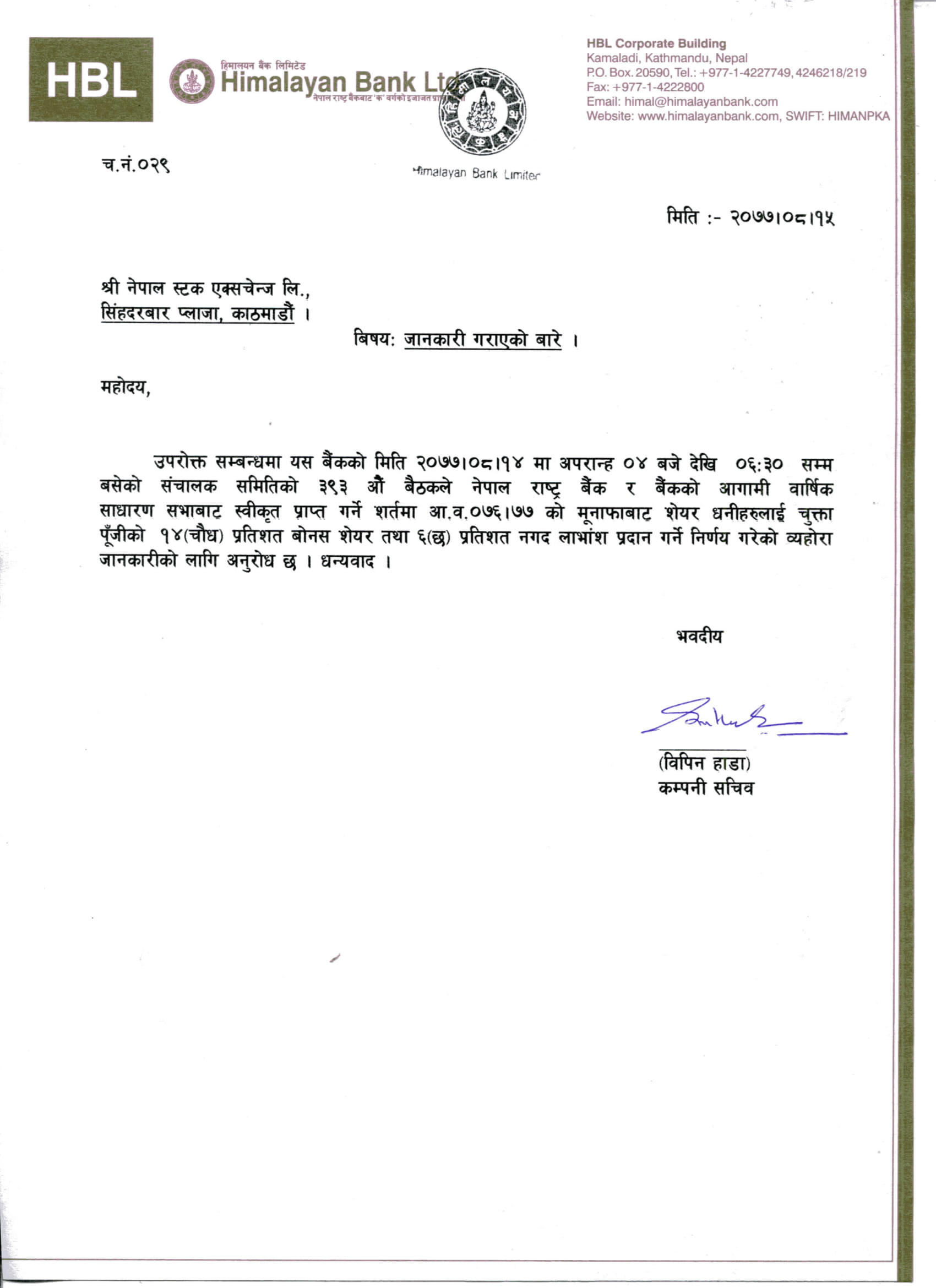 हिमालयन बैंकद्धारा लाभांश प्रस्ताव, बोनश र नगद कति ?