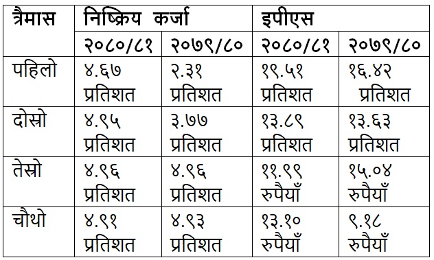 अघिल्लो आर्थिक वर्ष २०७९।८० र गत आर्थिक वर्ष २०८०।८१ मा बैंकको निष्क्रिय कर्जा बढ्दै गएको तथ्यांकले देखाएको हो। बढ्दै गएको निष्क्रिय कर्जालाई रोक्न बैंकले सकेको छैन। गत वर्ष असुलीमा जोडतोडले लागेको भए पनि कर्जा बढी मात्रामा निष्क्रिय बनेको छ।