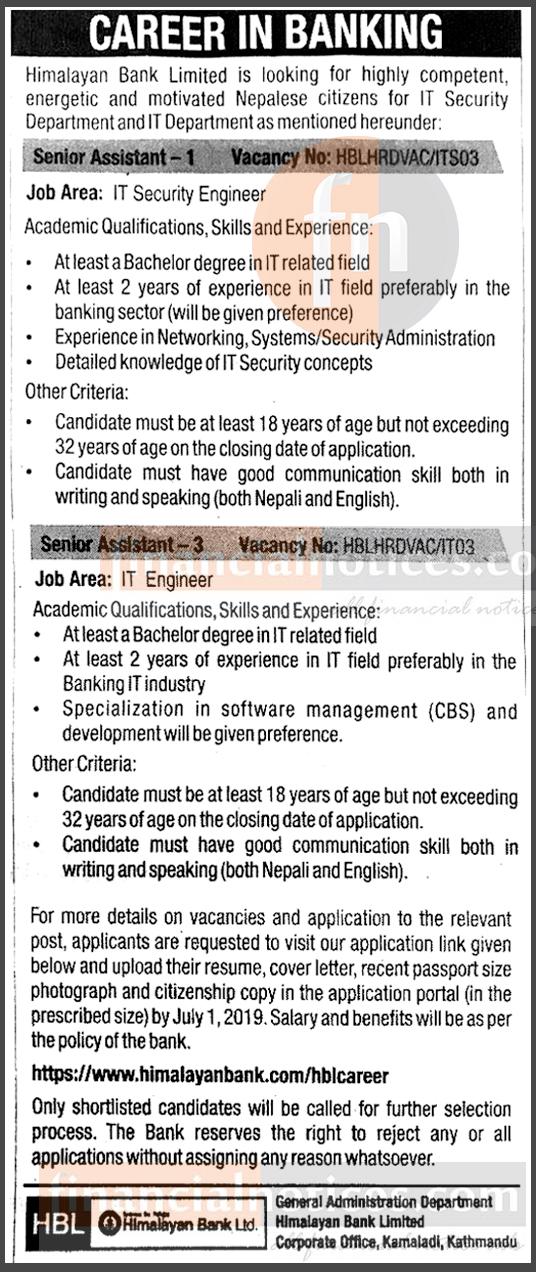 हिमालयन बैंकले विभिन्न पदमा कर्मचारी माग गरेको छ । बैंकले सिनियर एसिस्टेन्ट पदमा कर्मचारी माग गरेको हो ।
