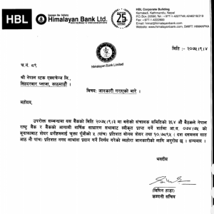 बैंकले प्रस्तावित लाभांश अनुमोदनका लागि राष्ट्र बैंक र आगामी वार्षिक साधारण सभामा पेश गर्नेछ ।