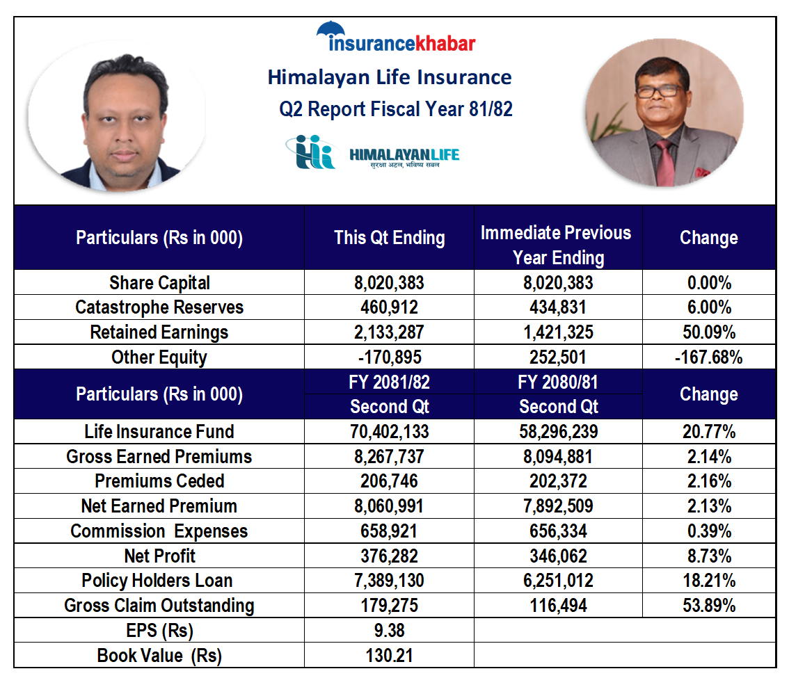 काठमाडौं । हिमालयन लाइफ इन्स्योरेन्स कम्पनीले चालु आर्थिक वर्षको दोस्रो त्रैमास (साउन–पुस)को अपरिष्कृत वित्तीय विवरण सार्वजनिक गरेको छ। दोस्रो त्रैमाससम्म कम्पनीले ३७ करोड ६२ लाख रुपैयाँ नाफा आर्जन गरेको छ। अघिल्लो वर्ष यही अवधिसम्म कम्पनीले ३४ करोड ६० लाख रुपैयाँ खुद नाफा आर्जन गरेको थियो। अघिल्लो वर्षको तुलनामा नाफा ८.७३ प्रतिशतले बढेको छ।