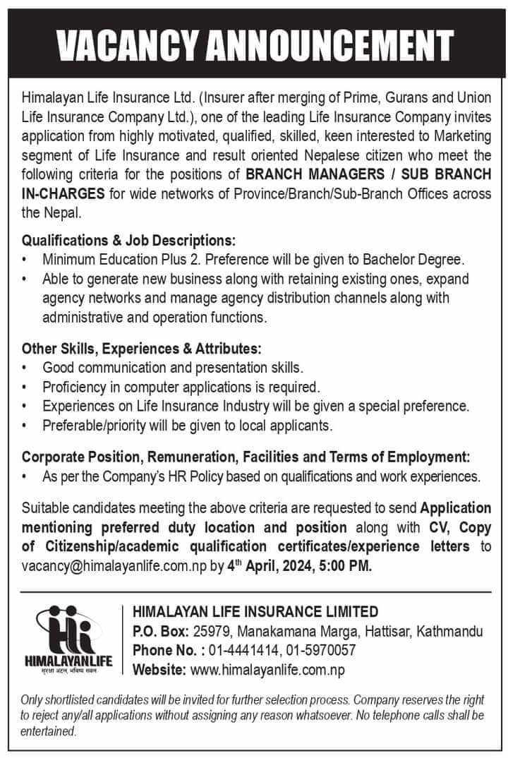 काठमाडौं । हिमालयन लाइफ इन्स्योरेन्स कम्पनीले माग गरेको कर्मचारीको लागि दरखास्त पेश गर्न ३ दिन बाँकी रहेको छ । कम्पनीले ब्रान्च म्यानेजर तथा सव ब्रान्च इन्चार्जका लागि कर्मचारी माग गरेको हो । कम्पनीले प्रदेश, ब्रान्च तथा विभिन्न उपब्रान्चका लागि कर्मचारी माग गरेको हो ।