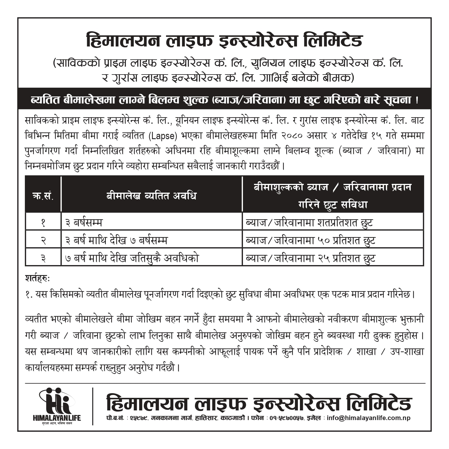 काठमाडौं । हिमालयन लाइफले व्यतित बीमालेखमा लाग्ने बिलम्ब शुल्कमा ब्याज छुट दिने जनाएको छ । साविक प्राइम लाइफ, गुराँस लाइफ र यूनियन लाइफबाट विभिन्न मितिमा बीमा गराई व्यतित भएका बीमालेखहरुमा असार ४ गतेदेखि असार १५ गतेसम्म पुनर्जागरण गर्दा बीमा शुल्कमा लाग्ने विलम्ब शुल्कमा ब्याज वा जरिवाना छुट दिने जनाएको हो ।