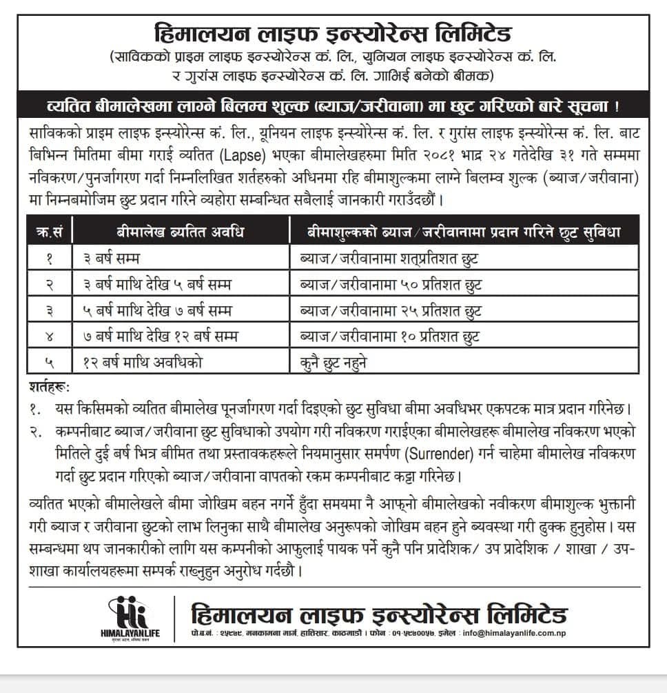 कम्पनीले व्यतित बीमालेखहरु आज भदौ २४ गतेदेखि भदौ ३१ गतेसम्म नवीकरण तथा पुनर्जागरण गर्दा लाग्ने ब्याज तथा जरिवानामा छुट हुने कम्पनीले जनाएको छ।