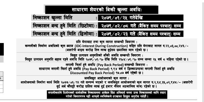 कम्पनीले आयोजना प्रभावित क्षेत्र अर्थात कास्की जिल्लाको मादी गाउँपालिका वडा नं १, २, ३, ४, ६ र ७ का स्थानिय बासिन्दाहरुका लागि आईपीओ निष्काशन गर्न लागेको हो ।