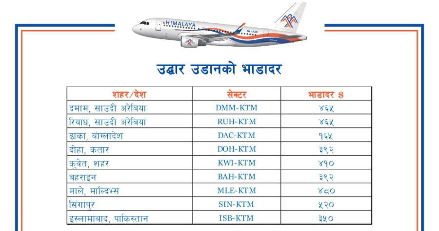 हिमालयले विदेशमा अलपत्र नेपाली स्वदेश फर्काउन विभिन्न मुलुकबाट गरिने उद्धार चार्टर्ड उडानको भाडादर सार्वजनिक गरेको छ । जसअनुरुप दमामका लागि ४६५ अमेरिकी डलर, रियादको ४६५, ढाकाको १६५, कुवेतको ३९२ डलर तोकिएको छ । त्यस्तै बहराइन्को ४१०, मालेको ४८०, सिङ्गापुरको ५२० र स्लामाबादको ३५० डरल कायम गरिएको छ ।