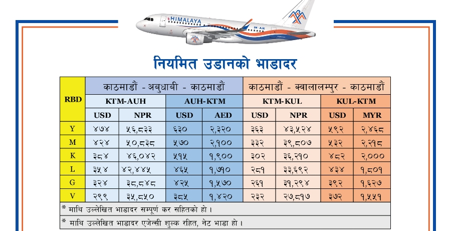 काठमाडौँ । नेपालको अन्तर्राष्ट्रिय उडान गर्ने एक मात्र निजि हवाई कम्पनी हिमालय एयरलाइन्सले नियमित उडानको नयाँ भाडादर सार्वजनकि गरेको छ । कोभिड–१९ को प्रभावका कारण सीमित देशहरुमा सुरक्षा मापदण्ड अपनाएर उडान भर्नु परेका कारण भाडादर सामान्य अवस्थाको भन्दा केही महंगो भएको सो एयरलाइन्सले जनाएको छ । साथै हवाई भाडा कालोबजारी हुनसक्ने भन्दै तोकिएको भाडादर भन्दा बढि भाडा लिएमा उजुरी गर्न समेत भनेको छ ।