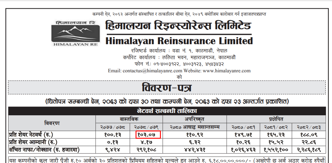 कम्पनीले सार्वजनिक गरेको विवरण पत्र अनुसार कम्पनीले आर्थिक वर्ष ७८/७९ सम्मको वास्तविक वित्तीय विवरण सार्वजनिक गरेको छ । आर्थिक वर्ष ७९/८० को असार मसान्तसम्मको विवरण अपरिस्कृत वित्तीय विवरण भएकाले आर्थिक वर्ष ७८/७९ को प्रति शेयर नेट्वर्थको आधारमा कम्पनीले पहिलो कारोबारको रेञ्ज पाउने सम्भावना छ ।