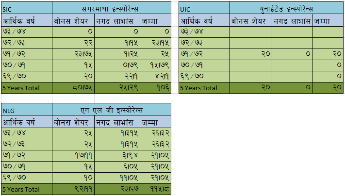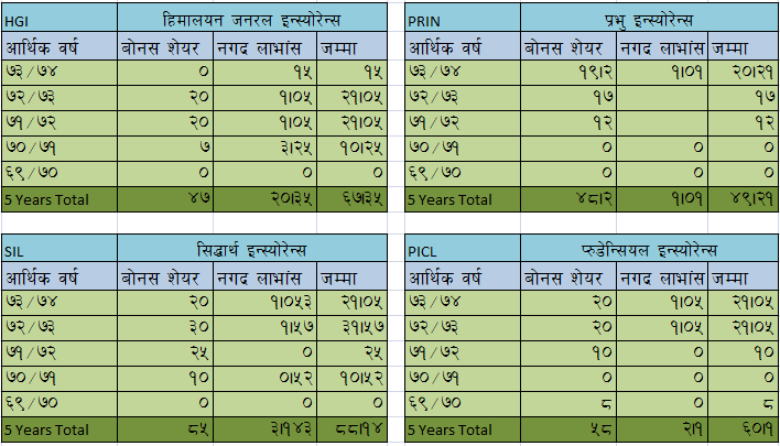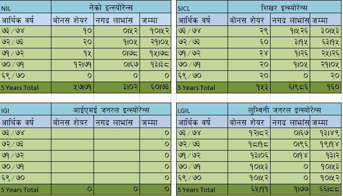 आर्थिक वर्ष २०६९ /७०  देखि आर्थिक वर्ष २०७३/७४ को समय भित्र प्रत्यक वर्ष लाभांस दिने कम्पनीहरु ३ वटा मात्र रहेका  छन् । एन एल जी इन्स्योरेन्स, लुम्बिनी जनरल इन्स्योरेन्स, शिखर इन्स्योरेन्स नेपालले मात्र लगातार ५ वर्ष लाभांस दिएको छन् ।