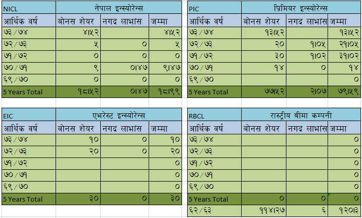 आईएमई जनरल  इन्स्योरेन्स (साबिकको एनबी इन्स्योरेन्स ) ले यो ५ वर्षको अवधिमा कुनै पनि लाभांस दिएको छैन भने रास्ट्रिय बीमा कम्पनीले भने यो ५ वर्ष अवधिको वार्षिक साधारण सभा नै गर्न बाँकी छ ।