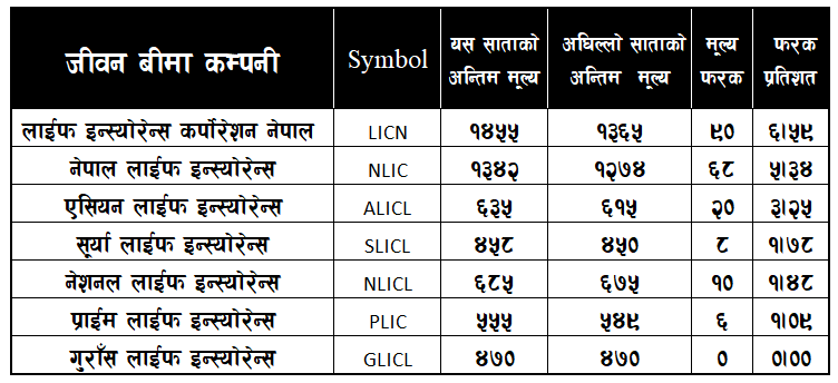 जीवन बीमा तर्फ एलआईसी नेपालले दोश्रो बजारमा राम्रो प्रदशन गरेको छ। एलआईसी नेपालको बजार मूल्य ६ दशमवल ५९ प्रतिशतले वृद्धि भएको छ । अघिल्लो साता प्रति कित्ता १३६५मा बजार मूल्य बन्द भएको कम्पनीको यो साता बजार मूल्य १४५५ रुपैयाँ प्रति कित्तामा बन्द भएको छ। त्यस्तै नेपाल लाईफ इन्स्योरेन्सको बजार मूल्य ५ दशमवल ३४ प्रतिशतले वृद्धि भएको छ। यो साता कुनै पनि जीवन बीमा कम्पनीको बजार मूल्य घटेको छैन । गुराँस लाईफ इन्स्योरेन्सको बजार मूल्य भने यथावत रहेको छ।