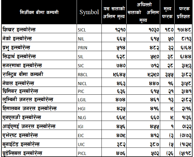 निर्जीवन बीमा तर्फ शिखर इन्स्योरेन्सको बजार मूल्य सर्वाधिक १७ दशमवल ४८ प्रतिशतले वृद्धि भएको छ । अघिल्लो साता प्रति कित्ता १०३०मा बजार मूल्य बन्द भएको कम्पनीको यो साता बजार मूल्य १२१० रुपैयाँ प्रति कित्तामा बन्द भएको छ । त्यस्तै दोश्रोमा नेको इन्स्योरेन्सको बजार मूल्य ८ दशमवल १३ प्रतिशतले वृद्धि भएको छ । यो साता ३ निर्जीवन बीमाको मात्र बजार मूल्य घटेको छ। एभरेस्ट इन्स्योरेन्स, युनाईटेड इन्स्योरेन्स र प्रुडेन्सियल इन्स्योरेन्सको बजार मूल्य घट्न पुगेको छ ।