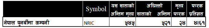 त्यस्तै यो साता नेपाल पुनर्बीमाको बजार मूल्य पनि प्रति कित्ता २४ रुपैयाँले वृद्धि हुँदै ४ दशमवल ६१ प्रतिशतले वृद्धि भएको छ। नेपाल पुनर्बीमाको बजार मूल्य ५४५ प्रति कित्ता यो साता बजार बन्द भएको छ।
