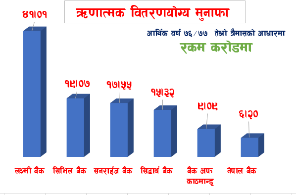 सम्पूर्ण वाणिज्य बैंकले आर्थिक वर्ष ७६/७७को तेश्रो त्रैमासको वित्तिय विवरण सार्वजनिक गरेका छन् । लकडाउनको कारणले धेरै बैंकको व्याज नउठेको कारण वाणिज्य बैंकको वितरण योग्य मुनाफा भने आकर्षक हुन् सकेको छैन । तेश्रो त्रैमाससम्म ६ वाणिज्य बैंकको वितरणयोग्य मुनाफा भने ऋणात्मक छ। वितरणयोग्य मुनाफा ऋणात्मक हुने वाणिज्य बैंकमा लक्ष्मी बैंक, सिभिल बैंक, सनराईज बैंक, सिद्धार्थ बैंक, बैंक अफ काठमान्डू र नेपाल बैंक रहेका छन् । लक्ष्मी बैंकको वितरणयोग्य मुनाफा सर्वाधिक ४१ करोड ऋणात्मक छ।