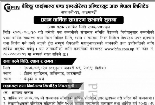 काठमाडौं । बैंकिङ फाइनान्स एन्ड इन्स्योरेन्स इन्ष्टिच्युट अफ नेपालको प्रथम वार्षिक साधारण सभा आज हुँदैछ । उक्त सभा होटल र्याडिसन, लाजिम्पाट काठमाडौंमा दिउसो ४ बजेबाट सुरु हुने जनाएको छ ।