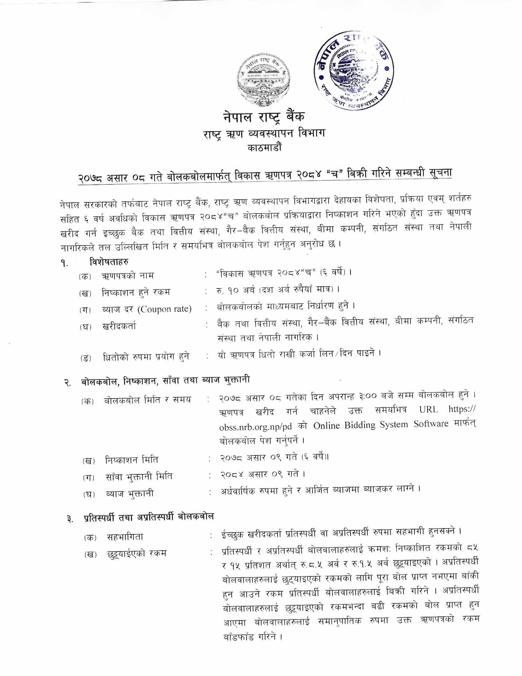 त्यसैगरी, उक्त ऋणपत्र बैंक तथा वित्तीय संस्था,गैर बैंक वित्तीय संस्था, बीमा कम्पनी,संगठित संस्था तथा नेपाली नागरिकले खरिद गर्न सक्नेछन् । खरिदकर्ताले राष्ट्र बैंकको राष्ट्र ऋण व्यवस्थापन विभागमा आवेदन दिनुपर्नेछ । उक्त ऋणपत्रको व्याजदर बोलकबोलको माध्यमबाट निर्धारण हुनेछ ।