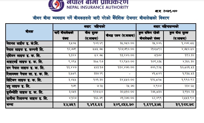 त्यस्तै, कम्पनीहरुले असार महिनामा मात्रै २४ करोड ९६ लाख रुपैयाँ कूल बीमाशुल्क आर्जन गर्न सफल भएका छन् । यी कम्पनीले ५४ हजार ७५१ वटा बीमालेख बिक्री गरेका थिए । जीवन बीमा कम्पनीहरुले असार मसान्तसम्ममा १ खर्ब ४२ अर्ब रुपैयाँमाथि कुल बीमाशुल्क आर्जन गरेका छन् ।