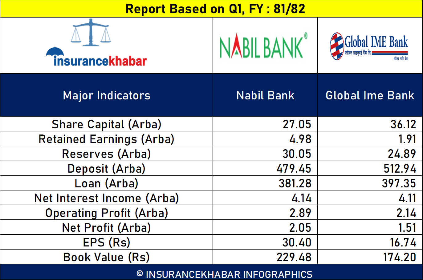 काठमाडौं । ग्लोबल आइएमई बैंक र नबिल बैंक नाफामा एक अर्कालाई टक्कर दिने वाणिज्य बैंक हुन् । दुवै बैंकले चालू आर्थिक वर्ष ८१/८२को पहिलो त्रैमासको वित्तीय विवरण सार्वजनिक गरेको अवस्थामा दुई बैंक बीच इन्स्योरेन्स खबरले प्रमुख वित्तीय सूचकलाई आधार मानेर गरेको तुलनात्मक अध्ययन :
