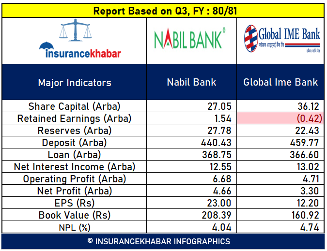 खुद मुनाफा : आर्थिक वर्ष ८०/८१को तेश्रो त्रैमासको वित्तीय विवरणको आधारमा नबिल बैंक लिमिटेडले ४ अर्ब ६६ करोड खुद नाफा गरेकोमा ग्लोबल आइएमई बैंक लिमिटेडले ३ अर्ब ३० करोड खुद नाफा गरेको छ ।