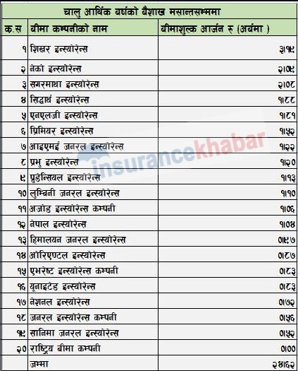 बीमा समितिको तथ्याङ्क अनुसार सिद्धार्थ इन्स्योरेन्सले १ अर्ब ८८ करोड रुपैयाँ, एनएलजी इन्स्योरेन्सले १ अर्ब ८१ करोड रुपैयाँ, प्रिमियर इन्स्योरेन्सले १ अर्ब ५२ करोड रुपैयाँ, आइएमई जनरल इन्स्योरेन्सले १ अर्ब २२ करोड रुपैयाँ, प्रभु इन्स्योरेन्सले १ अर्ब २० करोड रुपैयाँ, प्रुडेन्सियल इन्स्योरेन्सले १ अर्ब १३ करोड रुपैयाँ, लुम्बिनी जनरल इन्स्योरेन्सले १ अर्ब १० करोड रुपैयाँ, अजोड इन्स्योरेन्सले १ अर्ब ६ करोड रुपैयाँ र नेपाल इन्स्योरेन्सले १ अर्ब ४ करोड रुपैयाँ बीमाशुल्क आर्जन गर्न सफल भएका छन् ।