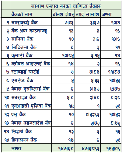 लाभांश प्रस्ताव गरिसकेका वाणिज्य बैंकहरु