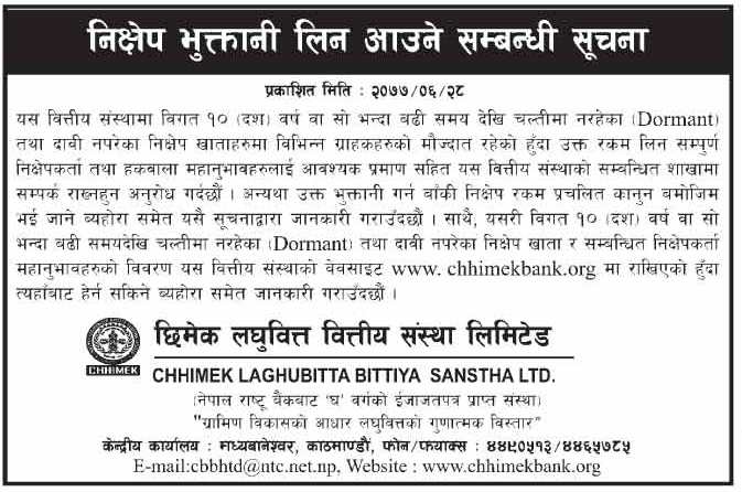 संस्थाले संस्थामा विगत दश वर्ष वा सो भन्दा बढी समयदेखि चल्तीमा नरहेका तथा दावी नपरेका निक्षेप खाताहरूमा विभिन्न ग्राहकहरूको मौज्दात रहेको बताउँदै उक्त रकम लिन सम्पुर्ण निक्षेपकर्ता तथा हकवालाहरूलाई आवश्यक प्रमाणसहित संस्थाको सम्बन्धित शाखामा सम्पर्क राख्न आग्रह गरेको हो ।