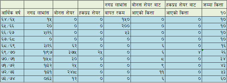 आर्थिक वर्ष ६४/६५ देखि आर्थिक वर्ष ६६/६७ सम्म प्रदान गरिएको नगद लाभांसको कर प्रयोजनार्थ रकमलाई पनि समावेश गरिएको छ भने आर्थिक वर्ष ६८/६९ देखि आर्थिक वर्ष ७३/७४ सम्मको बोनस शेयर प्रयोजनार्थ नगद लाभांस रहेको छ ।