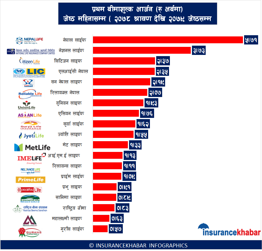 काठमाडौं । नेपालमा संचालित १९ जीवन बीमा कम्पनी मध्ये चालु आवको ११ महिनाको अवधिसम्म नयाँ व्यापार (प्रथम बीमा शुल्क आर्जन ) मा नेपाल लाइफ इन्स्योरेन्स अघि देखिएको छ । समितिले प्रदान गरेको तथ्यांक अनुसार चालु आर्थिक वर्षको ११ महिना अर्थात श्रावण देखि जेष्ठ महिनासम्म नेपाल लाइफले ५ अर्ब ७१ करोड प्रथम बीमा शुल्क आर्जन गरेको छ । नयाँ ग्राहकबाट पहिलो पटक लगिएको बीमा शुल्क नै प्रथम बीमा शुल्क हो । प्रथम बीमा शुल्क पश्चात ग्राहकले सो बीमा गरे बापत भविष्यमा आफ्नो बीमाको बीमा शुल्क तिर्ने भएकाले पनि प्रथम बीमा शुल्कलाई जीवन बीमा व्यवसायलाई निकै महत्व का साथ् हेरिन्छ । ११ महिनाको अवधिमा नेपाली जीवन बीमा व्यवसायले भने ३३ अर्ब ८५ करोड प्रथम बीमा शुल्क आर्जन गरेको छ।