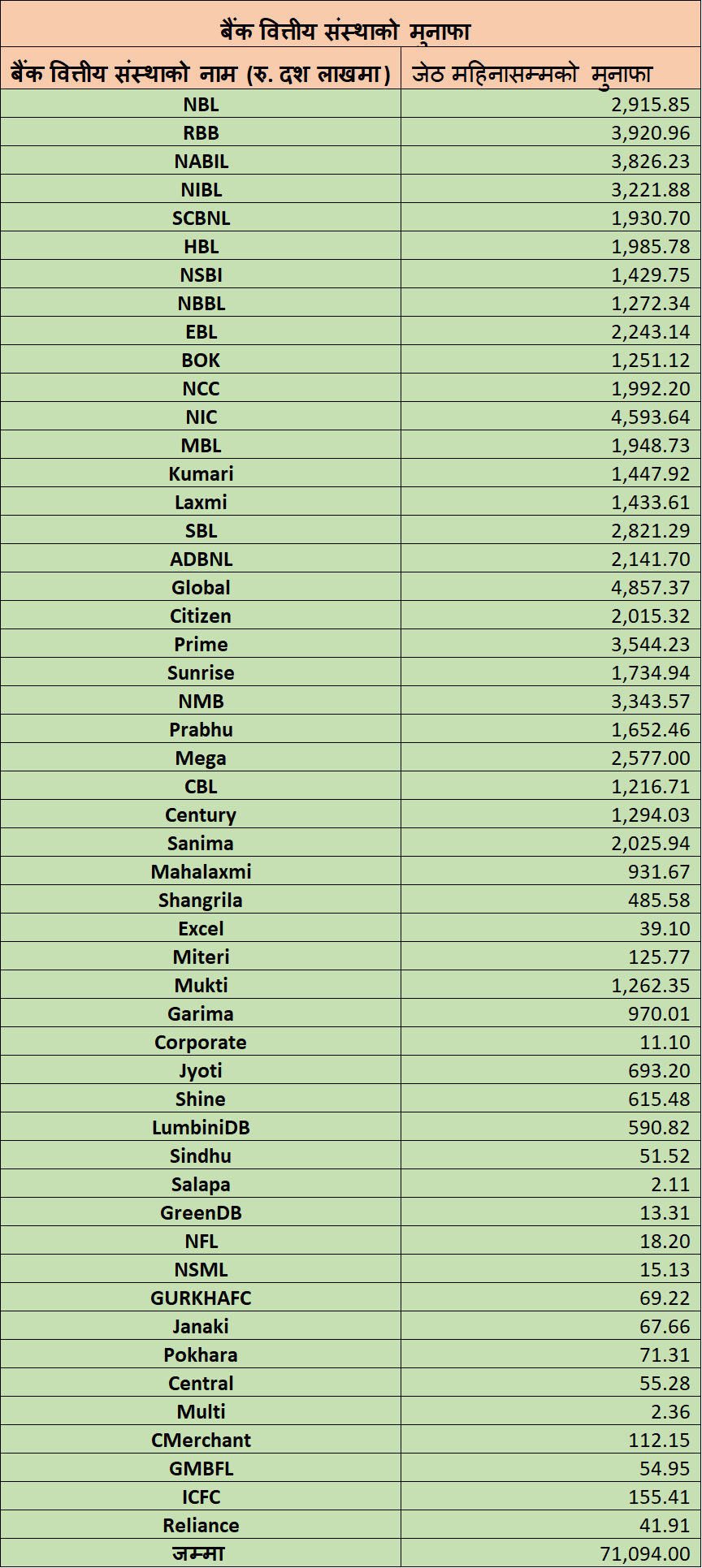 यस महिनामा पनि राष्ट्रिय स्तरको विकास बैंक मुक्तिनाथले बाणिज्य बैंकहरु ग्लोबल आइएमई र सिभिल बैंकलाई उछिनेको छ । मुक्तिनाथको मुनाफा एक अर्ब २६ करोड रुपैयाँ छ । बाणिज्य बैंकहरु मध्ये सर्वाधिक कम सिभिलको एक अर्ब २१ करोड रुपैयाँ छ । तर यस पटक सिभिलको मुनाफामा उल्लेख्य सुधार आएको छ ।