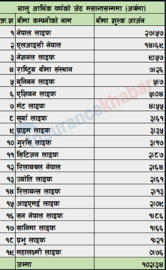 समितिको तथ्याङ्क अनुसार जेठ मसान्तसमममा सरकारी स्वामित्वमा रहेको राष्ट्रिय बीमा संस्थानले ७ अर्ब २६ करोड रुपैयाँ, यूनियन लाइफले ५ अर्ब ७० करोड रुपैयाँ, एशियन लाइफले ५ अर्ब ४ करोड रुपैयाँ, मेट लाइफले ४ अर्ब ५५ करोड रुपैयाँ, सूर्या लाइफले ३ अर्ब ६१ करोड रुपैयाँ, प्राइम लाइफले ३ अर्ब ३५ करोड रुपैयाँ, गुँरास लाइफले ३ अर्ब १७ करोड रुपैयाँ र सिटिजन लाइफले २ अर्ब ८७ करोड रुपैयाँ बीमाशुल्क आर्जन गर्न सफल भएका छन् ।