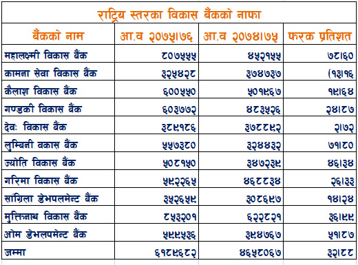 ११ वटा विकास बैंक मध्ये आर्थिक वर्ष २०७५।७६ को चौथो त्रैमाससम्ममा सबै विकास बैंकहरुको नाफामा बृद्धि देखिएको छ । सबैभन्दा धेरै नाफा मुक्तिनाथ विकास बैंकको रहेको छ । बैंकले आर्थिक वर्ष २०७५।७६ को चौथो त्रैमाससम्ममा ८५ करोड ३२ लाख रुपैयाँ नाफा आर्जन गरेको छ । अघिल्लो आर्थिक वर्षको सोही अवधिमा बैंकले ६२ करोड २८ लाख रुपैयाँ मुनाफा आर्जन गरेको थियो । अघिल्लो आर्थिक वर्षको सोही अवधिको तुलनामा बैंकको नाफा ३६ प्रतिशते बढी हो ।