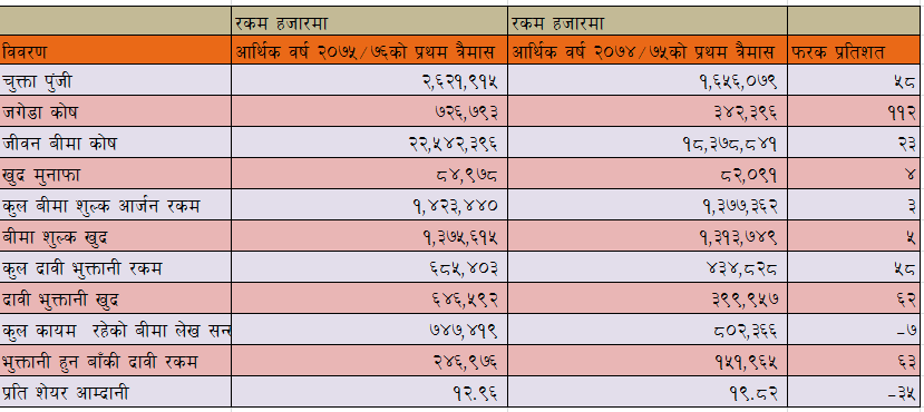नेशनल लाईफ इन्स्योरेन्सको आर्थिक वर्ष २०७५/७६कोे प्रथम त्रैमासको वित्तिय विवरण :कम्पनीले सार्वजनिक गरेको चालु आर्थिक वर्षको प्रथम त्रैमासिक वित्तीय विवरण अनुसार आर्थिक वर्ष २०७५/७६  र २०७४/७५ बीच तुलना गर्दा :