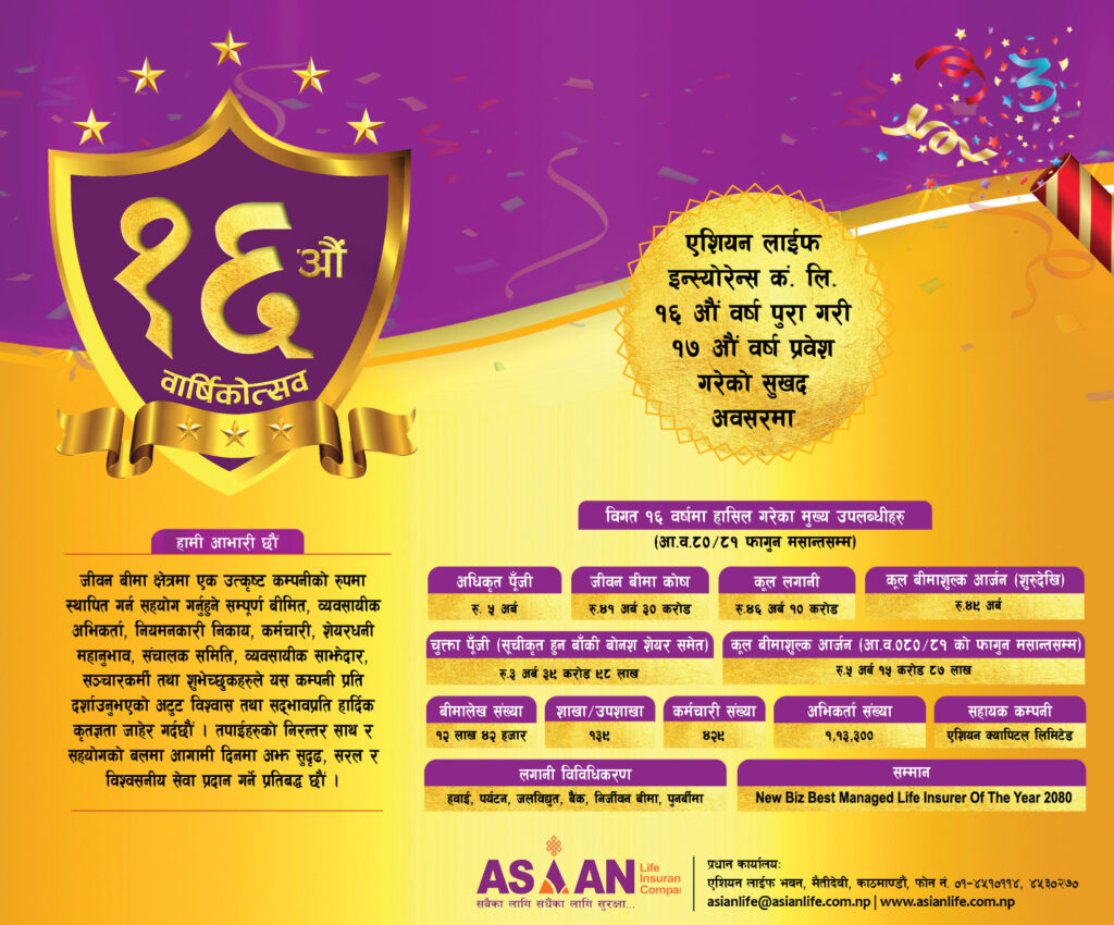 १६ औं वार्षिकोत्सव मनाउँदै एशियन लाइफ, हवाईदेखि हाइड्रोसम्म लगानी विविधीकरण