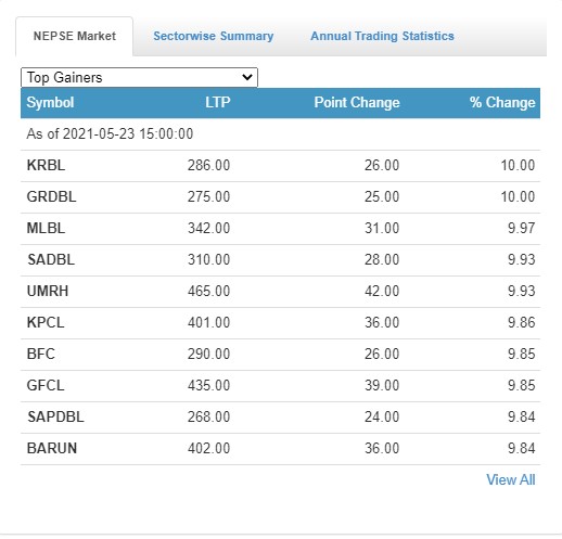 त्यस्तै, १६ कम्पनीको शेयरमा सकारात्मक सर्किट लागेको छ। कर्णली डेभलपमेन्ट बैंक र ग्रिन डेभलपमेन्ट बैंकका लगानीकर्ताले १० प्रतिशतका दरले कमाएका छन् भने महालक्ष्मी बैंकका लगानीकर्ताले ९ दशमलव ९६ प्रतिशतका दरले कमाएका छन् ।