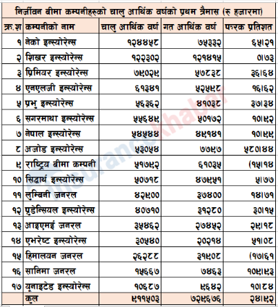 लुम्बिनी जनरल इन्स्योरेन्स कम्पनीले चालु आर्थिक वर्षको प्रथम त्रैमासमा ४ करोड २९ लाख रुपैयाँ नाफाआर्जन गरेको छ । गत आर्थिक वर्षको सोही अवधिको तुलनामा कम्पनीको नाफा १४ प्रतिशतले बढी हो । प्रुडेन्सियल इन्स्योरेन्स कम्पनीले गत आर्थिक वर्षको सोही अवधिको तुलनामा नाफा ३० प्रतिशतले बृद्धि गर्न सफल भएको छ । गत आर्थिक वर्षको सोही अवधिमा ३ करोड १२ लाख रुपैयाँ नाफा कमाएको कम्पनीले चालु आवमा ४ करोड ७ लाख रुपैयाँ नाफा कमाएको छ ।