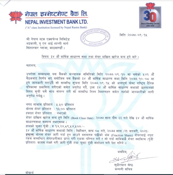 नेपाल इन्भेष्टमेन्ट बैंकले आगामी माघ ८ गते, बिहीबार बिहान १० बजे बैंकको केन्द्रीय कार्यालय, दरबारमार्गमा ३४ औँ वार्षिक साधारण सभा आह्वान गरेको हो । भौतिक रुपमा डिजिटल माध्यमबाट उपस्थित हुन सकिने साधारणसभाले दुई जना सञ्चालक समेत निर्वाचित गर्नेछ ।