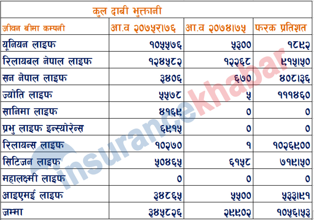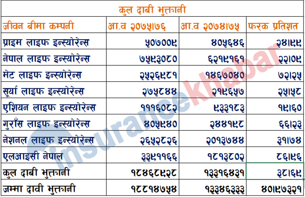 आर्थिक वर्ष २०७५र ७६ को चौथो त्रैमाससम्मको अवधिसम्म आइपुग्दा वित्तीय विवरण प्रकाशित गरेका ९ वटा पुराना जीवन बीमा कम्पनी भएपनि कुल दाबी भुक्तानीको आधारमा ८ वटा कम्पनीहरुमध्ये सबैभन्दा धेरै एलआइसी नेपाल इन्स्योरेन्सको कुल दावी भुक्तानी ८६ प्रतिशतले बृद्धि भएको छ । कम्पनीले आर्थिक वर्ष २०७५।७६ को चौथो त्रैमाससम्म आइपुग्दा तीन अर्ब ३९ ११ लाख रुपैयाँ कुल दाबी भुक्तानी गरेको छ । गत आर्थिक वर्षमा कम्पनीले एक अर्ब ८१ करोड ३८ लाख रुपैयाँ मात्र कुल दाबी भुक्तानी गरेको थियो ।