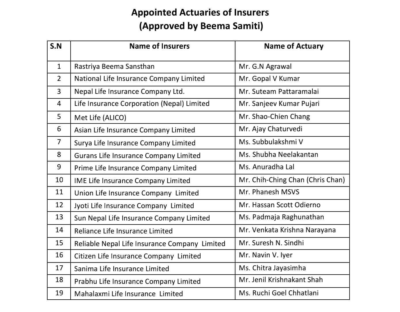जीवन बीमा कम्पनीले नियुक्ति गरेका सम्पुर्ण एक्चुअरी विदेशी छन् । अधिकाम्स एक्चुअरी भारतीय नागरिक रहेका छन् । नेपाल लाइफले सुतिम पट्रामलाइलाई नियुक्त गरेको छ । त्यस्तै नेशलन लाइफले गोपाल भि कुमार, राष्ट्रिय बीमा संस्थानले जिएन अग्रवाल, एलआइसीले सञ्जिव कुमार पुजारीलाई नियुक्त गरेको छ ।