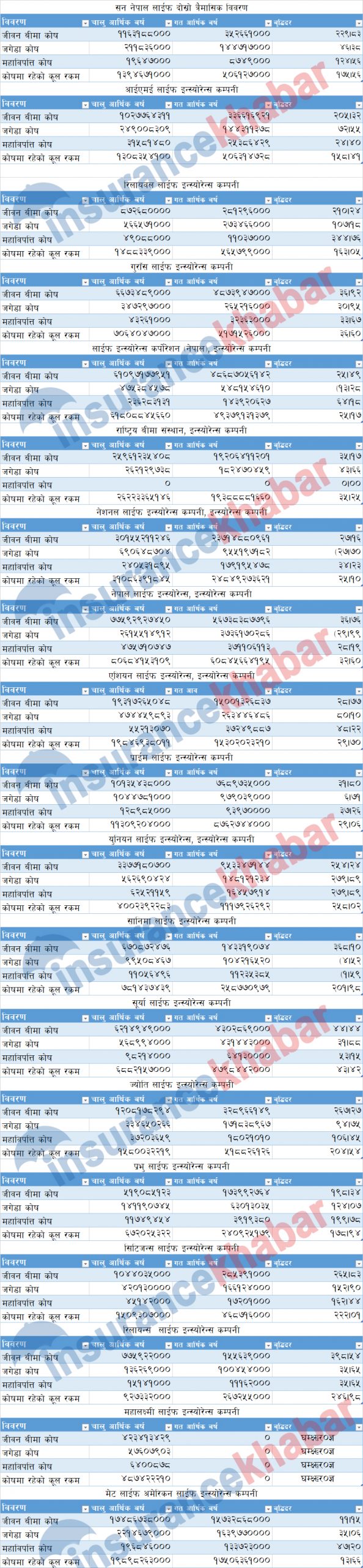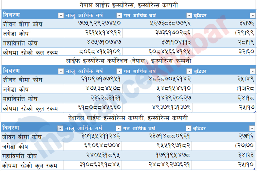 चालु आवको पौष महिनासम्ममा नेपालमा सञ्चालनमा रहेका १९ वटा जीवन बीमा कम्पनीले जीवन बीमा कोष, जगेडा कोष तथा महाविपत्ति कोषमा गरी कूल दुई खर्ब ६७ अर्ब ७६ करोड ६५ लाख ४८ हजार ४९९ रुपैयाँ कोषमा जम्मा गरेका छन् ।