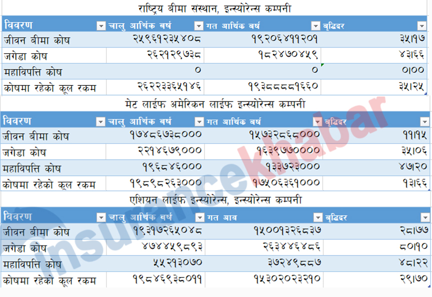 कम्पनीको जीवन बीमा कोषमा २५ अर्ब ९६ करोड रुपैयाँ संचि रहेको छ । गत बर्षको सोहि अवधिमा कम्पनीको जीवन बीमा कोषमा १९ अर्ब २० करोड रुपैयाँ संचित रहेको थियो । गत बर्षको तुलनामा कम्पनीको जीवन बीमा कोषमा ३५ प्रतिशतले वृद्धि भएको छ । जगेडा कोषमा २६ करोड २१ लाख रुपैयाँ संचित रहेको छ । गत बर्षको सोहि अवधिमा कम्पनीको जगेड कोषमा १८ करोड २४ लाख रुपैयाँ संचित रहेको थियो । संस्थानको महाविपत्ति कोषमा भने रकम छुटाएको छैन ।