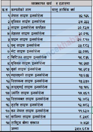 लाइफ इन्स्योरेनस कर्पोशन (नेपाल)ले ३ करोड ८ लाख रुपैयाँ, प्राइम लाइफले २ करोड ७८ लाख रुपैयाँ, प्रभु लाइफले २ करोड ५८ लाख रुपैयाँ, मेट लाइफले २ करोड ३० लाख रुपैयाँ, सिटिजन लाइफले १ करोड ९८ लाख रुपैयाँ, एसियन लाइफले १ करोड ९२ लाख रुपैयाँ, सूर्या लाइफले १ करोड ९२ लाख रुपैयाँ, महालक्ष्मी लाइफले १ करोड ५१ लाख रुपैयाँ र रिलायन्स लाइफले १ करोड ५३ लाख रुपैयाँ व्यवस्थापन खर्च गरेका छन्।
