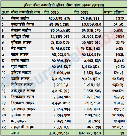 १९ जीवन बीमा कम्पनीको जीवन बीमा कोषमा तीन खर्ब ६४ अर्ब संचिती, कुन कम्पनीको कति ?