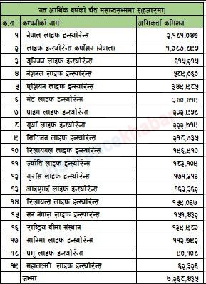 त्यस्तै, नेशनल लाइफले तेस्रो त्रैमाससम्ममा अभिकर्ता कमीशन मार्फत ५८ करोड रुपैयाँ, एसियन लाइफ इन्स्योरेन्सले ३४ करोड रुपैयाँ, मेट लाइफले ३४ करोड रुपैयाँ र प्राइम लाइफले २३ करोड रुपैयाँ, सूर्या लाइफले २२ करोड रुपैयाँ सिटिजन लाइफले २१ करोड रुपैयाँ, रिलायबल लाइफले १९ करोड रुपैयाँ र ज्योति लाइफले १८ करोड रुपैयाँ अभिकर्ता कमीशनमा खर्चिएका छन् ।