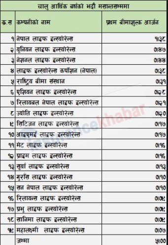 समितिको तथ्याङ्क अनुसार लाइफ इन्स्योरेन्स कर्पोशन (नेपाल)ले ३८ करोड रुपैयाँ, सरकारी स्वामित्वमा रहेको राष्ट्रिय बीमा संस्थानले ३१ करोड रुपैयाँ, एशियन लाइफले २८ करोड रुपैयाँ, रिलायबल लाइफले २१ करोड रुपैयाँ, ज्योति लाइफले २० करोड रुपैयाँ, सिटिजन लाइफले १७ करोड रुपैयाँ र आइएमई लाइफले १७ करोड रुपैयाँ प्रथम बीमाशुल्क आर्जन गर्न सफल भएका छन् ।