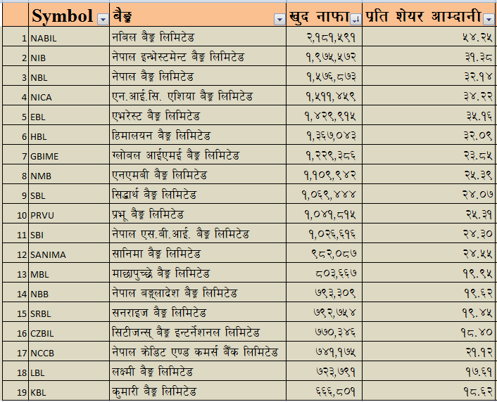 खुद नाफाको आधारमा नबिल बैंक अघि छ । नबिल बैंकले दोश्रो त्रैमास सम्म २ अर्ब १८ करोड खुद नाफा गरेको छ। प्रति शेयर आम्दानीको आधारमा पनि नबिल बैंक अघि छ । नबिल को प्रति शेयर आम्दानी ५४ रुपैया २५ पैसा छ ।