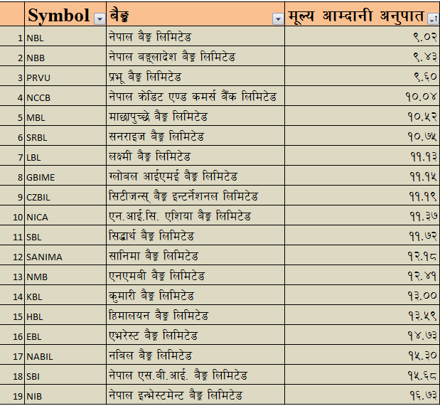 अहिले १९ वटा वाणिज्य बैंकको औसत मुल्य आम्दानी अनुपात १३ गुणा छ। १० देखि २० सम्मको मूल्य आम्दानी अनुपातलाई लगानीयोग्य ठानिन्छ। यो हिसाबमा वाणिज्य बैंकको शेयर “अण्डर भ्यालुड जोन” तर्फ छन भन्न सकिन्छ ।