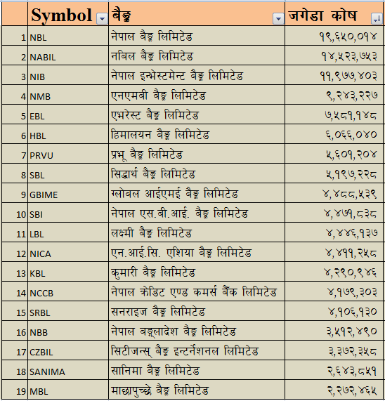 जगेडा कोषमा नेपाल बैंक सबै भन्दा बलियो  देखिएको छ। नेपाल बैंकको जगेडामा १९ अर्ब ६५ करोड रुपैयाँ संचित छ ।