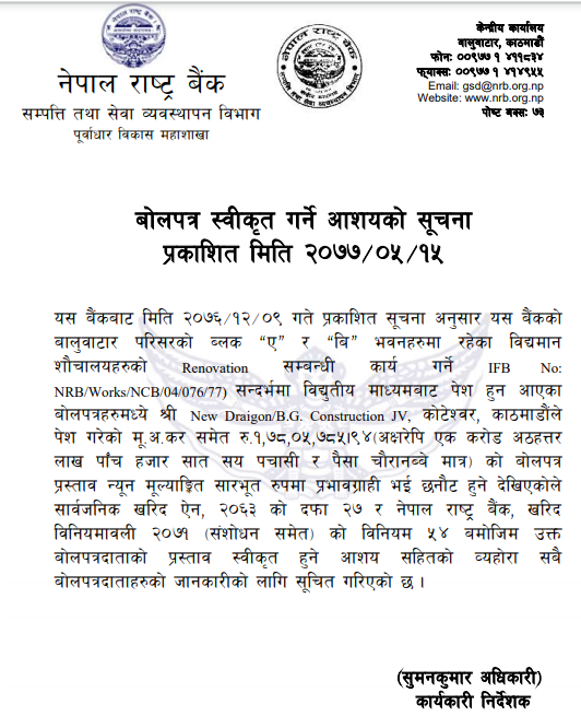 सो कार्यका लागि ठेक्का ड्रयागन बिजी कन्स्ट्रक्सनले लिएको छ । कन्स्ट्रक्सनले शौचालयको मर्मत सम्भारका लागि १ करोड ७८ लाख ५ हजार ७ सय ८५ रुपैयाँ ९४ पैसामा ठेक्का लिएको हो ।